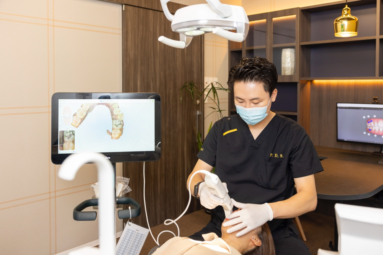 マウスピース矯正治療に必要な検査を行います。お口の中をスキャンするだけで精密な型が取れる専用のスキャナーを使い、現在の歯並びをチェックします。